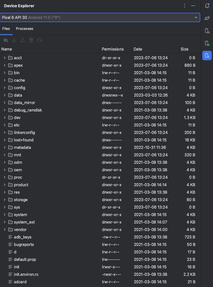 بیشتر دادههای دستگاه قابل مشاهده نیستند، مگر اینکه از یک دستگاه روتشده یا یک شبیهساز با تصویر سیستم اندروید استاندارد (AOSP) استفاده کنید. اگر از شبیهسازهایی با تصویر سیستم Google APIs یا Google Play استفاده میکنید، دسترسی شما محدود خواهد بود.